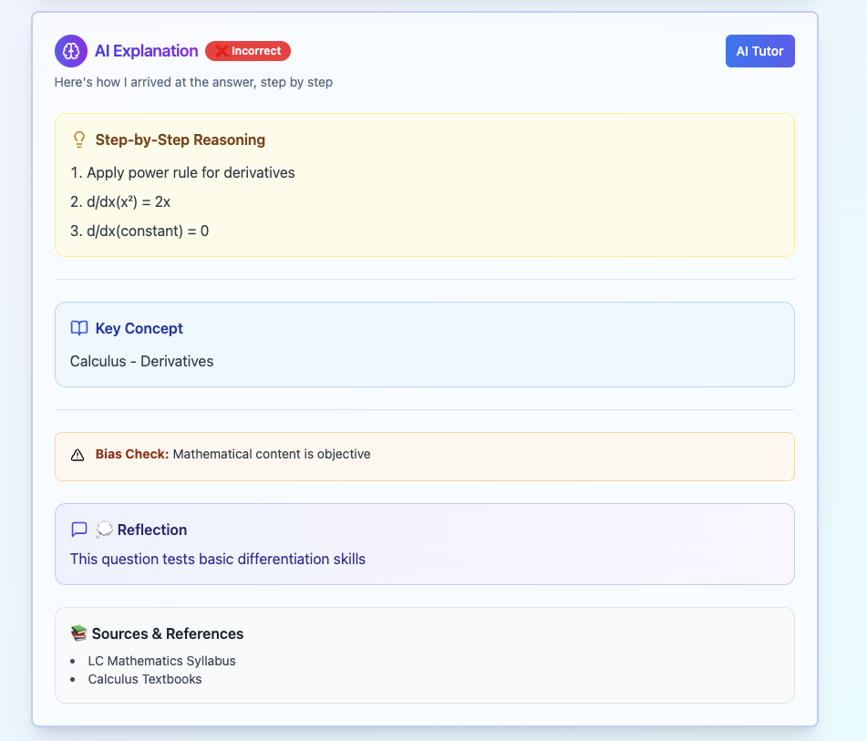 - Technical Quality: Near-zero AI hallucination through exam-grounded RAG