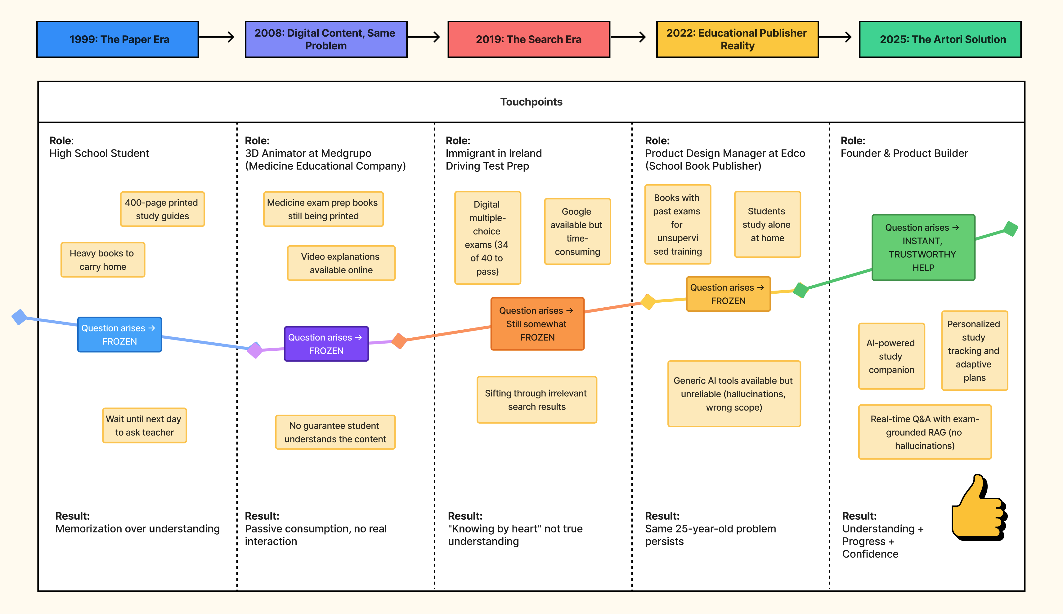 Artori is an AI-powered study platform that tracks student progress while preparing for exams, uses AI to analyze their learning patterns, plans personalized next steps, suggests structured exam simulations, and provides instant answers when students encounter doubts—eliminating the "frozen student" moment that has persisted since 1999.