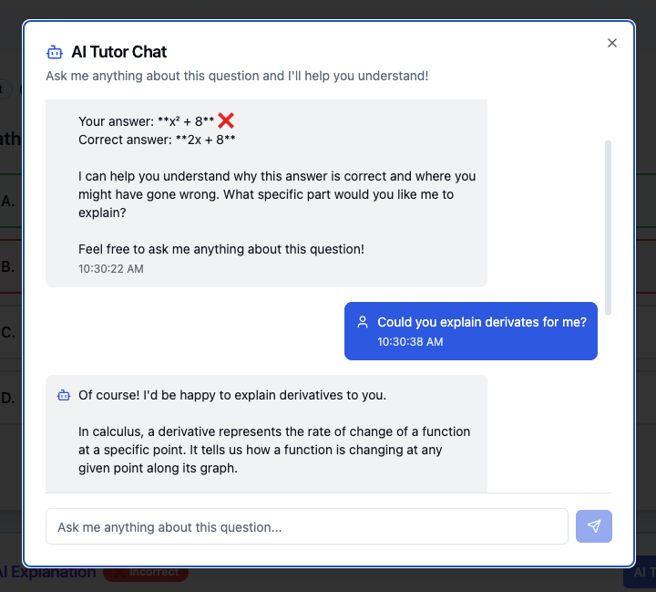 - Contextual Q&A: Students ask questions; AI provides exam-grounded answers (not generic responses)